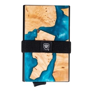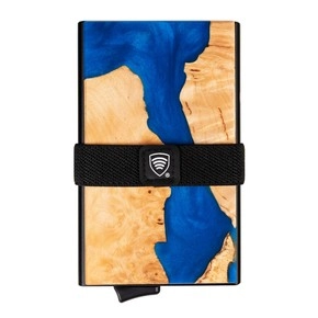 Hliníková peněženka s výsuvnými kartami a ochranou na bezdotykové karty (dřevo + modrá pryskyřice)