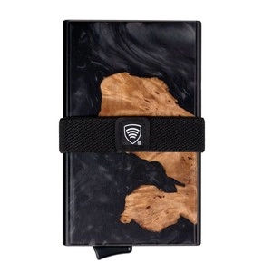 Hliníková peněženka s posuvníky na karty a ochranou bezkontaktních karet (dřevo + černá pryskyřice)