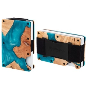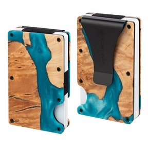 Hliníková peněženka s výsuvnými kartami a ochranou na bezdotykové karty (dřevo + tyrkysová pryskyřice)