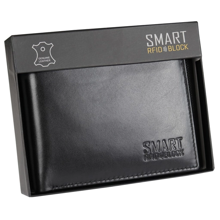 Pánská černá kožená peněženka se zabudovanou ochranou karet RFID BLOCK proximity.