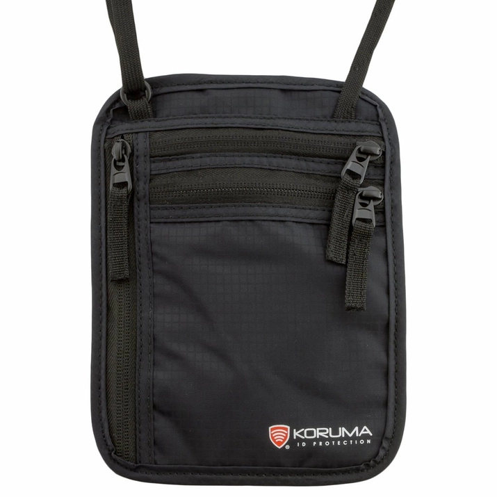 Diskrétní pouzdro na cestovní pas, černé pouzdro na krk s vestavěnou ochranou RFID STOP™, která chrání bezkontaktní karty a biometrické pasy před neoprávněným čtením údajů. Pouzdro i zipy jsou vyrobeny z voděodolných materiálů, takže dokumenty v něm uložené jsou v bezpečí za každé situace. Na zadní straně pasu je vzdušná síťovina, takže při kontaktu s tělem dochází k odvětrávání. K dispozici je také rukojeť, kterou lze pouzdro připnout k opasku u kalhot, pokud ho nechcete nosit na krku. Velké množství kapes umožňuje oddělit dokumenty tak, aby byly kdykoli rychle k dispozici. Celek je zavěšen na nastavitelném popruhu. Po zavěšení na krk lze nastavit v rozmezí 30-60 cm). Pouzdro na pas lze nosit pod nebo přes oblečení.
