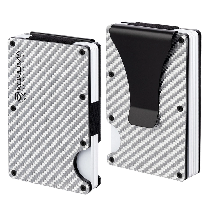 Hliníkové pouzdro na karty proti krádeži s klipem na bankovky nebo jako spona na opasek. Klip je součást, kterou lze vyjmout vyšroubováním šroubů pomocí šroubováku, který je součástí sady. Karty umístěné mezi dlaždicemi drží na místě pomocí pevných gumiček. Pouzdro je zvenku pokryto karbonem stříbrné barvy.
