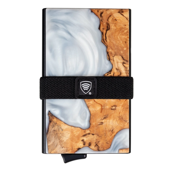 Hliníková peněženka s posuvníky na karty a ochranou bezkontaktních karet (dřevo + bílá pryskyřice)