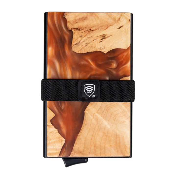Hliníková peněženka s posuvníky na karty a ochranou bezkontaktních karet (dřevo + oranžová pryskyřice)