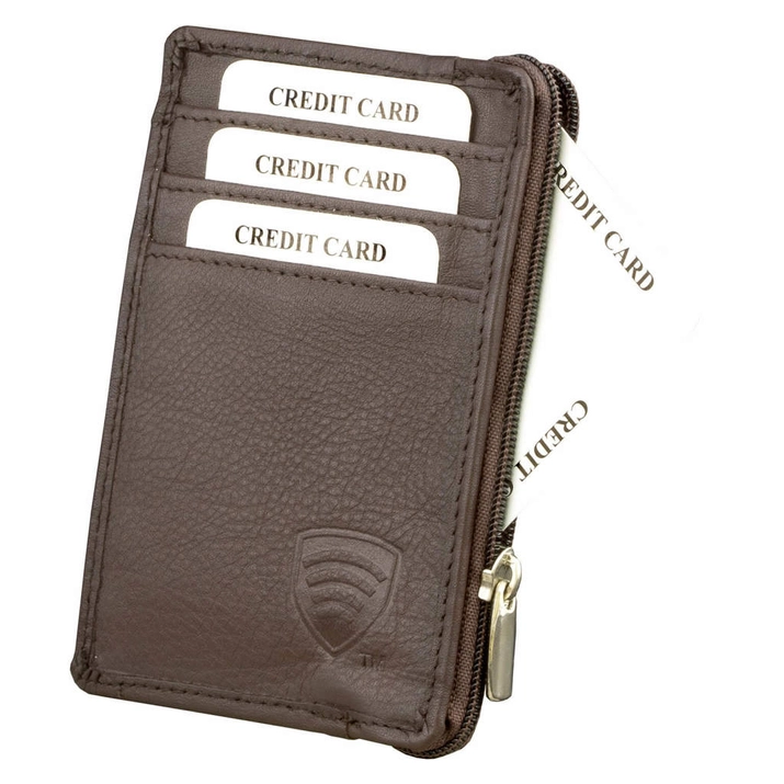 Malá kožená peněženka na karty s velkou kapsou na zip, 3 vnějšími přihrádkami na karty a tzv. okénkem na zadní straně.